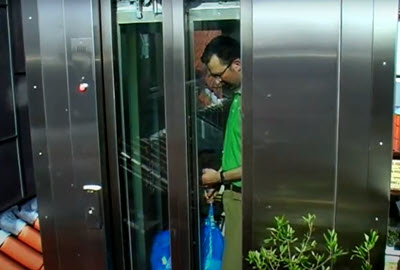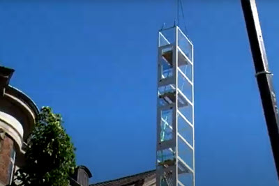 Familie på 5. sal klarer hverdagen med elevator. Elevatoren er etableret mellem eksisterende altaner, og betjener 2 lejligheder pr. etage.