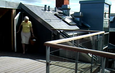 Ny elevator i køkkentrapperummet blev kombineret med anlæg af tagterrasse. Nu nyder beboerne, at køre op til terrassen og nyde udsigten og den åbne himmel.