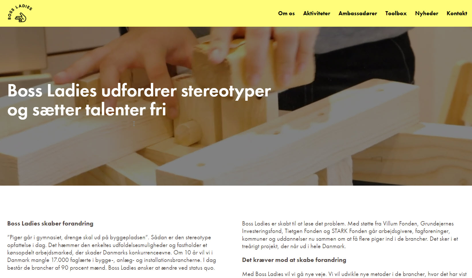 I størstedelen af byggebrancherne har andelen af kvinder været uændret de seneste 20 år. Boss Ladies udvikler metoder i de brancher, hvor det er vanskeligst at tiltrække kvindeligt talent. Skaber forandringer i skolerne, praktikforløb, uddannelser og arbejdspladser.